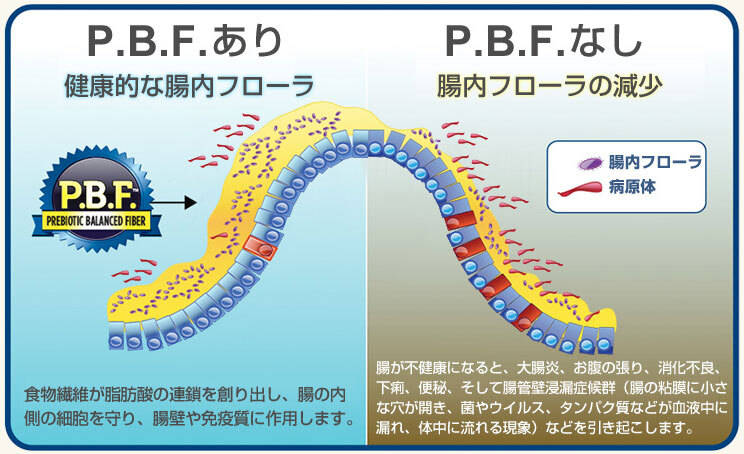プレバイオティクスは一般的に、その多くが腸に届く前に弱ってしまいます。 そこでルーシーペットプロダクツは、独自の技術 「プレバイオティクス バランスファイバー(P.B.F.)」 によって複数のプレバイオティクスをブレンドしていますので、胃での消化に耐え確実に腸内フローラに栄養を届けることができ、 体全体の健康を促進させることが可能となっているのです。