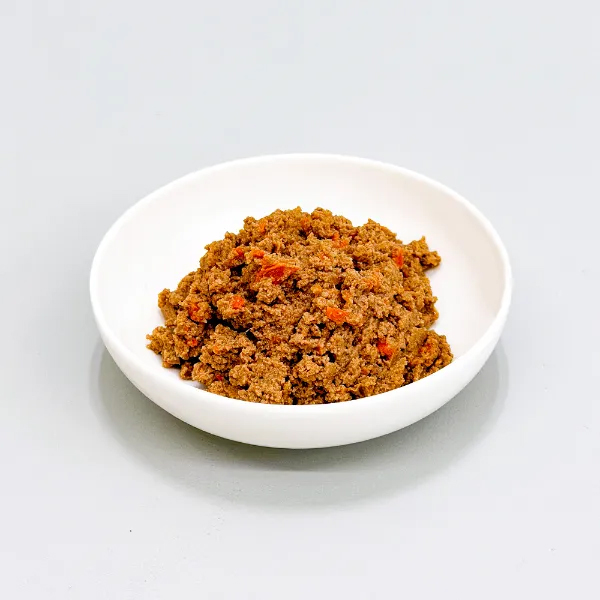 - サーモン、サーモンスープ、チキンレバー、鶏肉、サバ、玄米、チキンハツ、人参、亜麻仁粉、乾燥酵母、乾燥ビートパルプ、クランベリー、ブルーベリー、フラクトオリゴ糖、増粘安定剤(寒天)、ビタミン類、ミネラル類、アミノ酸類(タウリン)