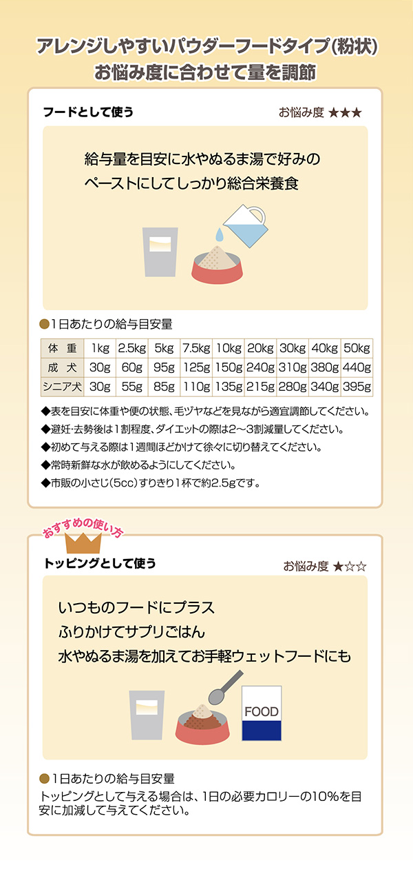 おなかのデリケートな子はフードを簡単に変える事が難しい事に配慮して、トッピングとしても使えるパウダーフードをご用意しました。