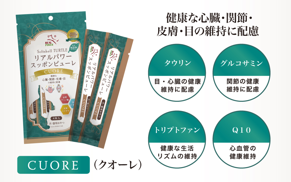 水、チキン、チキンオイル、台湾産スッポン、鮭油(オメガ3の供給源)、スッポン卵粉末、卵黄粉末、キャットニップ、かつお節、こんにゃく粉