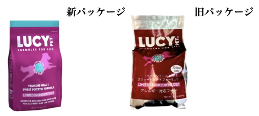 この度、「ルーシーペット ドライフードDOG ベニソンミール&スウィートポテト 普通粒4.5ポンド」のパッケージについて一時的な混載をご報告させていただきます。